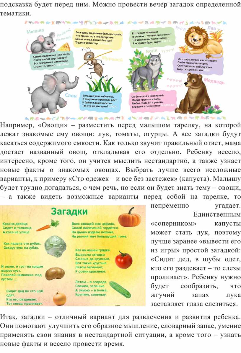 Итак, загадки – отличный вариант для развлечения и развития ребенка. Они помогают улучшить его образное мышление, словарный запас, умение применять свои знания в нестандартной ситуации, а кроме того – узнать новые факты и весело провести время.