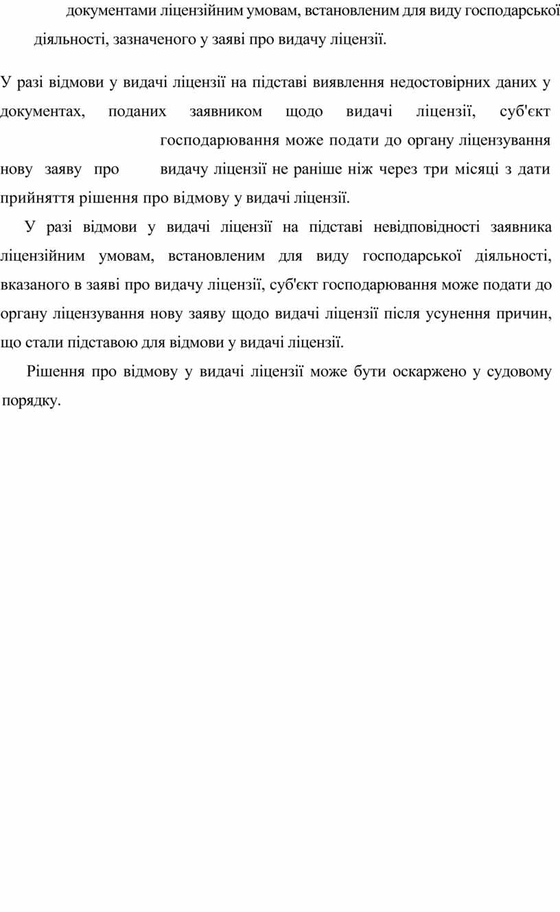 - для отримання ліцензії; - невідповідність заявника згідно з поданими документами ліцензійним умовам, встановленим для виду господарської діяльності, зазначеного у заяві про видачу ліцензії.