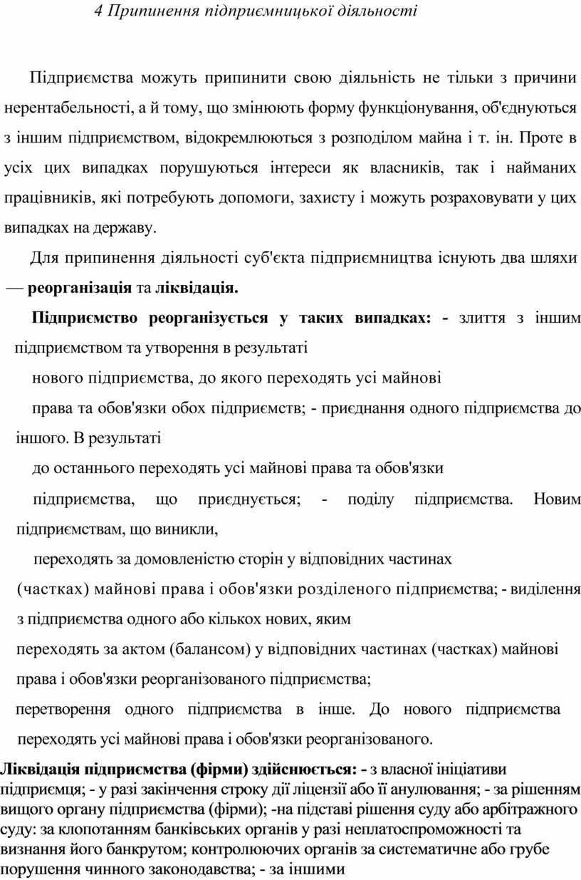 * Припинення діяльності суб'єкта підприємництва здійснюється шляхом його реорганізації або ліквідації.