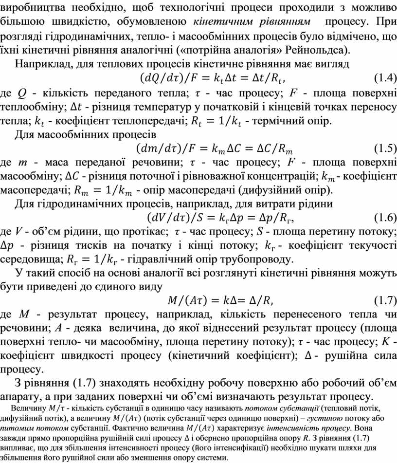 З рівняння (1.7) знаходять необхідну робочу поверхню або робочий об’єм апарату, а при заданих поверхні чи об’ємі визначають результат процесу.