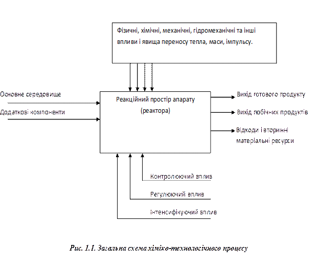 Таким чином, у процесі беруть участь основне середовище і компоненти, що додатково вводяться, при цьому застосовуються фізико-хімічні, механічні чи гідромеханічні впливи, що здійснюються усередині реакційних просторів апаратів, і в результаті процесу одержують кінцеві продукти (рис. 1.1).