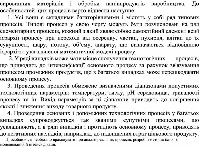 1. Усі вони є складними багаторівневими і містять у собі ряд типових процесів. Типові процеси у свою чергу можуть бути розчленовані на ряд елементарних процесів, кожний з який являє собою самостійний елемент всієї ієрархії процесу при переході від осередку, частки, пухирця, клітки до їх сукупності, шару, потоку, об’єму, апарату, що визначається відповідною ієрархією узагальненої математичної моделі процесу.