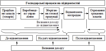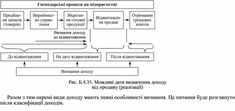 Для визначення моменту визнання доходу потрібно знати економічний зміст господарської операції, внаслідок якої отримується дохід. Внаслідок врахування вимог принципу превалювання «змісту над формою дохід від продажу реалізації може бути визнаний як на дату відвантаження, так і до чи або після неї (рис. Б.4.35).