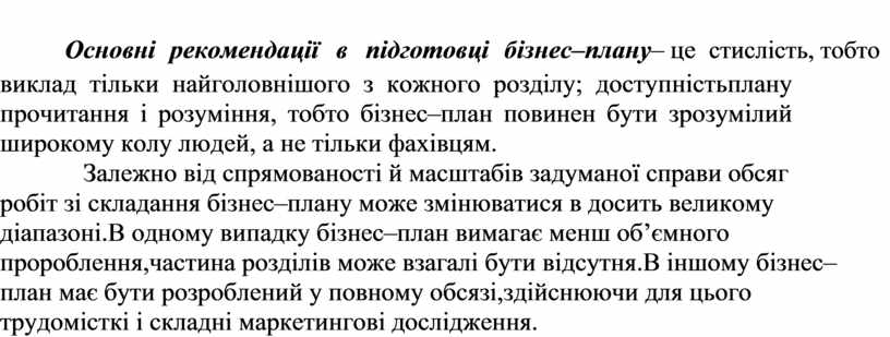Основні рекомендації в підготовці бізнес–плану– це стислість, тобто