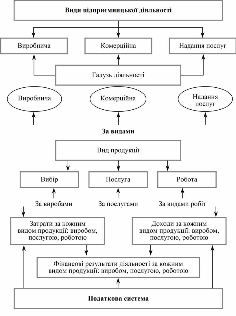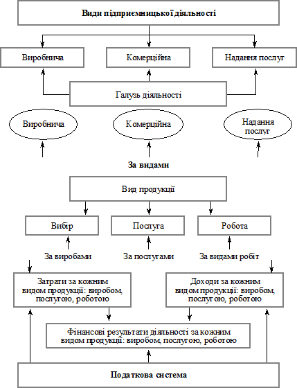 Це означає, що вихідними чинниками (факторами) побудови діяльності є: вид діяльності, галузь діяльності, вид продукції. Затрати на кожний вид продукції, доходи від кожного виду продукції, фінансовий результат (прибуток) від кожного виду продукції, податкова система.
