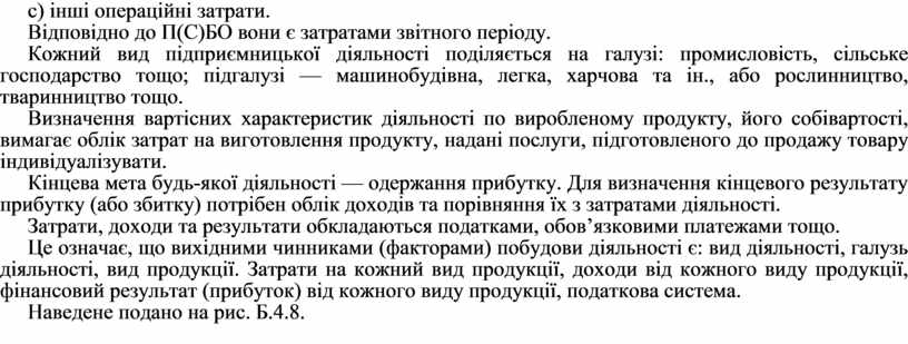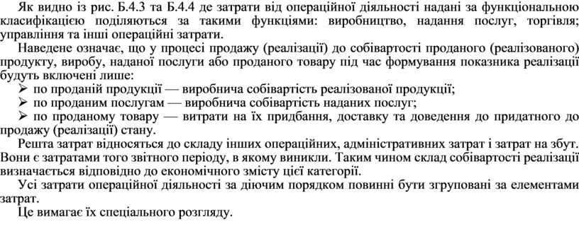 У кожному виді діяльності затрати виконують різні функції. Як видно із рис. Б.4.3. затрати в процесі операційної діяльності за функціональною класифікацією поділяються на: затрати на виробництво, затрати на продаж (реалізацію), затрати на адміністративне управління та інші операційні затрати. Тому у собівартості проданого продукту, наданої послуги або проданого товару будуть включені: