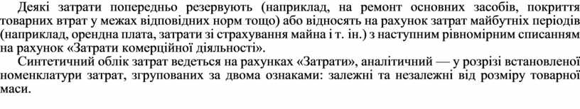 Деякі затрати попередньо резервують (наприклад, на ремонт основних засобів, покриття товарних втрат у межах відповідних норм тощо) або відносять на рахунок затрат майбутніх періодів (наприклад, орендна плата, затрати зі страхування майна і т. ін.) з наступним рівномірним списанням на рахунок «Затрати комерційної діяльності».
