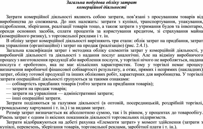 Загальна класифікація затрат і методика обліку елементів затрат у комерційній діяльності, у виробничій діяльності та діяльності з надання послуг аналогічні. Але на відміну виробничого процесу з виготовлення продукції або вироблення послуги, у торгівлі нічого не виробляється, надана послуга є «роботою», яка не має кількісних характеристик. Тому у торгівлі немає процесу визначення виробничої фінансової собівартості результату, а отже, прямих і непрямих (накладних) затрат, обліку готової продукції та інших облікових робіт, характерних для виробництва. У торгівлі затрати операційної діяльності групуються за такими ознаками: