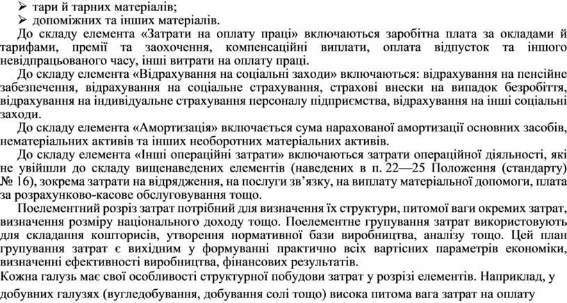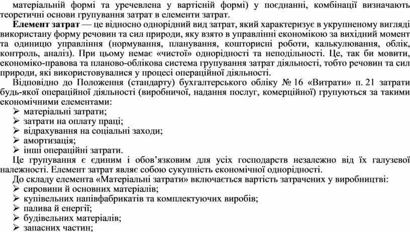 Відповідно до Положення (стандарту) бухгалтерського обліку № 16 «Витрати» п. 21 затрати будь-якої операційної діяльності (виробничої, надання послуг, комерційної) групуються за такими економічними елементами: