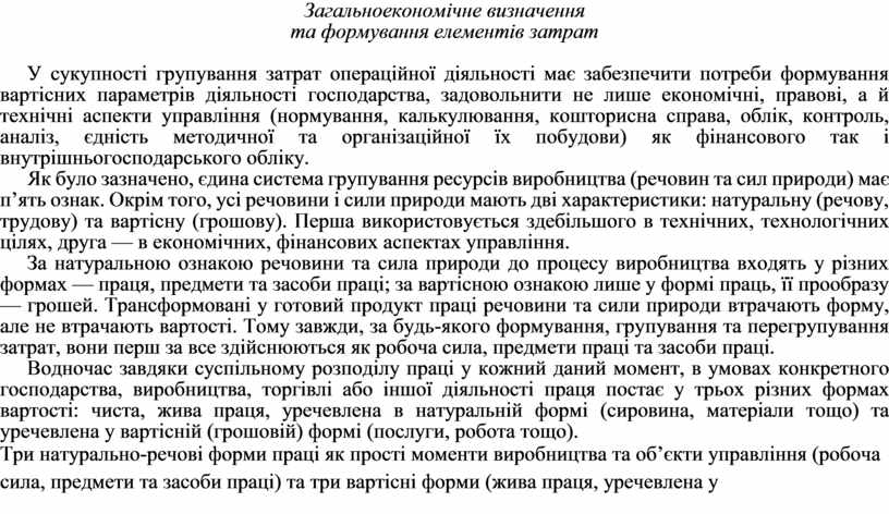 За натуральною ознакою речовини та сила природи до процесу виробництва входять у різних формах — праця, предмети та засоби праці; за вартісною ознакою лише у формі праць, її прообразу — грошей. Трансформовані у готовий продукт праці речовини та сили природи втрачають форму, але не втрачають вартості. Тому завжди, за будь-якого формування, групування та перегрупування затрат, вони перш за все здійснюються як робоча сила, предмети праці та засоби праці.