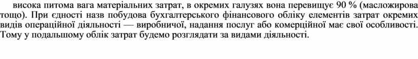 Кожна галузь має свої особливості структурної побудови затрат у розрізі елементів. Наприклад, у добувних галузях (вугледобування, добування солі тощо) висока питома вага затрат на оплату праці, у машино-, приладобудуванні та деяких інших галузях матеріальні затрати майже дорівнюють затратам на оплату праці, їх відношення близькі до 5:3, у харчовій промисловості висока питома вага матеріальних затрат, в окремих галузях вона перевищує 90 % (масложирова тощо). При єдності назв побудова бухгалтерського фінансового обліку елементів затрат окремих видів операційної діяльності — виробничої, надання послуг або комерційної має свої особливості. Тому у подальшому облік затрат будемо розглядати за видами діяльності.