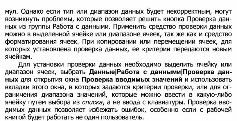 мул. Однако если тип или диапазон данных будет некорректным, могут возникнуть проблемы, которые позволяет решить кнопка Проверка дан- ных из группы Работа с данными. Применить средство проверки данных можно в выделенной ячейке или диапазоне ячеек, так же как и средство форматирования ячеек. При копировании или перемещении ячеек, для которых установлена проверка данных, ее критерии передаются новым ячейкам.