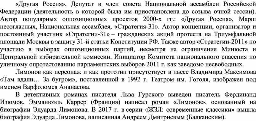 В настоящее время известен как русский писатель, поэт, публицист, российский политический деятель, бывший председатель запрещенной в России Национал-болыневистской партии (НБП), нынешний председатель одноименных партии и коалиции «Другая Россия». Депутат и член совета Национальной ассамблеи Российской Федерации (деятельность в которой была им приостановлена до созыва очной сессии). Автор популярных оппозиционных проектов 2000-х гг.: «Другая Россия», Марш несогласных, Национальная ассамблея, «Стратегия-31». Автор концепции, организатор и постоянный участник «Стратегии-31» – гражданских акций протеста на Триумфальной площади Москвы в защиту 31-й статьи Конституции РФ. Также автор «Стратегии-2011» по участию в выборах оппозиционных партий, несмотря на ограничения Минюста и Центральной избирательной комиссии. Инициатор Комитета национального спасения по уличному опротестованию парламентских выборов 2011 г. как заведомо несвободных.