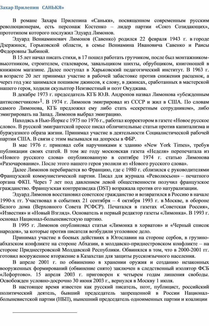 В романе Захара Прилепина «Санькя», посвященном современным русским революционерам, есть персонаж Костенко – лидер партии «Союз Созидающих», прототипом которого послужил Эдуард Лимонов.