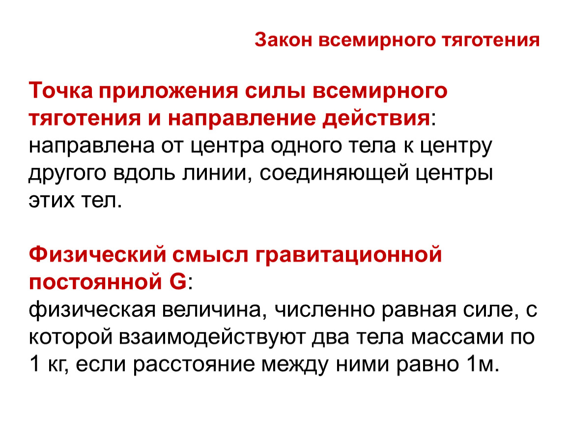 Точка приложения силы всемирного тяготения и направление действия: направлена от центра одного тела к центру другого вдоль линии, соединяющей центры этих тел.