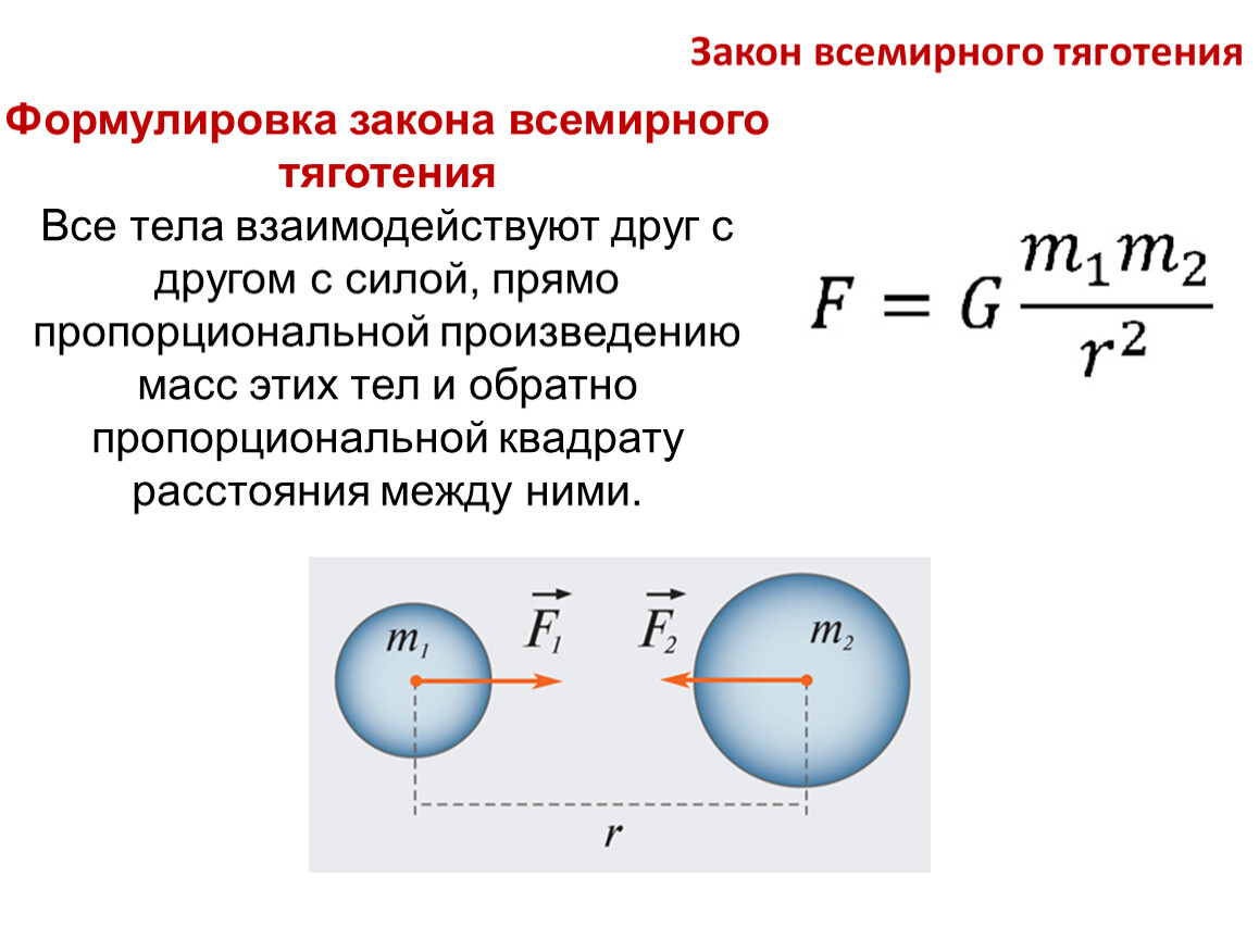 Формулировка закона всемирного тяготения Все тела взаимодействуют друг с другом с силой, прямо пропорциональной произведению масс этих тел и обратно пропорциональной квадрату расстояния между ними.