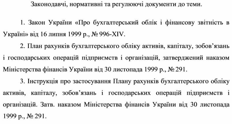 2. План рахунків бухгалтерського обліку активів, капіталу, зобов’язань і господарських операцій підприємств і організацій, затверджений наказом Міністерства фінансів України від 30 листопада 1999 р., № 291.