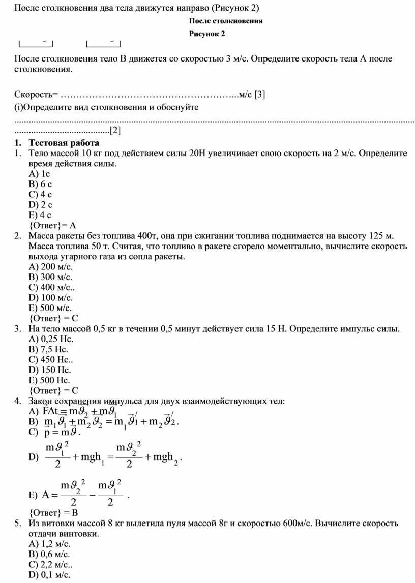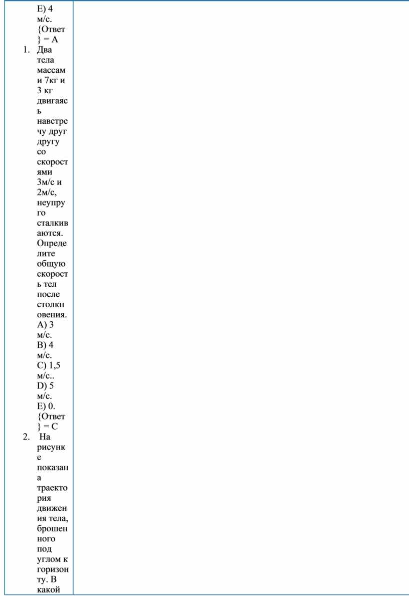 Скорость= ………………………………………………...м/с [3] (і)Определите вид столкновения и обоснуйте ................................................................................................................................................................................................................[2] 2. Тестовая работа 1. Тело массой 10 кг под действием силы 20Н увеличивает свою скорость на 2 м/с. Определите время действия силы. A) 1с B) 6 с C) 4 с D) 2 с E) 4 с {Ответ}= A 2. Масса ракеты без топлива 400т, она при сжигании топлива поднимается на высоту 125 м. Масса топлива 50 т. Считая, что топливо в ракете сгорело моментально, вычислите скорость выхода угарного газа из сопла ракеты. A) 200 м/с. B) 300 м/с. C) 400 м/с.. D) 100 м/с. E) 500 м/с. {Ответ} = С 3. На тело массой 0,5 кг в течении 0,5 минут действует сила 15 Н. Определите импульс силы. A) 0,25 Нс. B) 7,5 Нс. C) 450 Нс.. D) 150 Нс. E) 500 Нс. {Ответ} = С 4. Закон сохранения импульса для двух взаимодействующих тел: A) B) C) D) E) {Ответ} = В 5. Из витовки массой 8 кг вылетила пуля массой 8г и скоростью 600м/с. Вычислите скорость отдачи винтовки. A) 1,2 м/с. B) 0,6 м/с. C) 2,2 м/с.. D) 0,1 м/с. E) 4 м/с. {Ответ} = A 6. Два тела массами 7кг и 3 кг двигаясь навстречу друг другу со скоростями 3м/с и 2м/с, неупруго сталкиваются. Определите общую скорость тел после столкновения. A) 3 м/с. B) 4 м/с. C) 1,5 м/с.. D) 5 м/с. E) 0. {Ответ} = C 7. На рисунке показана траектория движения тела, брошенного под углом к горизонту. В какой точке сумма кинетической и потенциальной энергии максимальна?