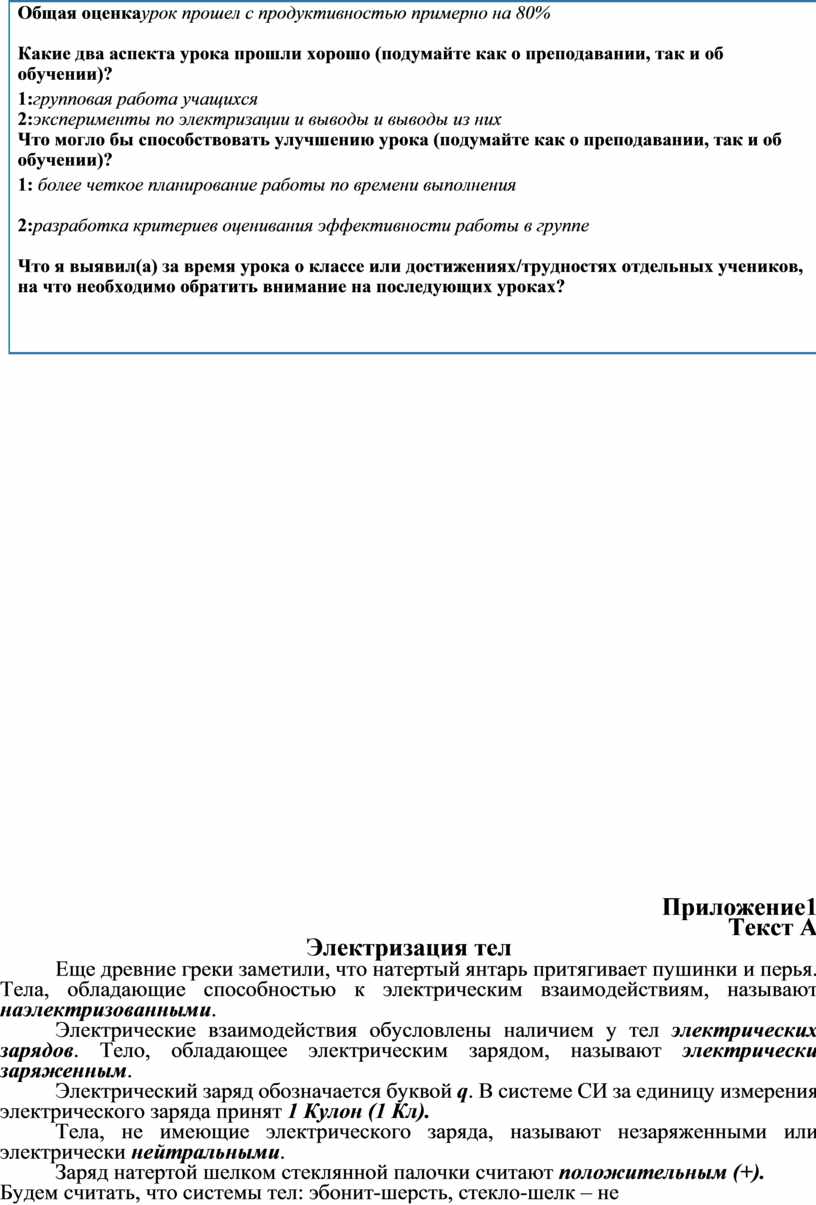 Какие два аспекта урока прошли хорошо (подумайте как о преподавании, так и об обучении)? 1:групповая работа учащихся 2:эксперименты по электризации и выводы и выводы из них Что могло бы способствовать улучшению урока (подумайте как о преподавании, так и об обучении)? 1: более четкое планирование работы по времени выполнения