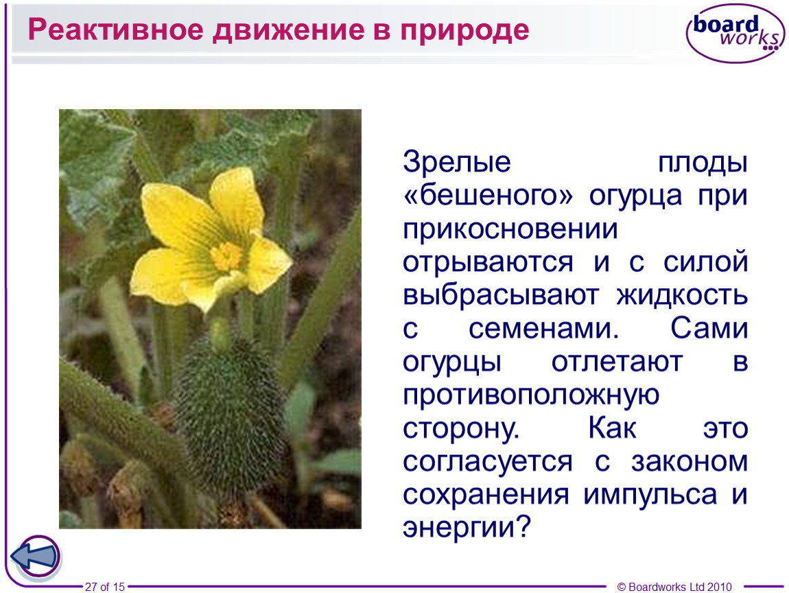 Зрелые плоды «бешеного» огурца при прикосновении отрываются и с силой выбрасывают жидкость с семенами. Сами огурцы отлетают в противоположную сторону. Как это согласуется с законом сохранения импульса и энергии?