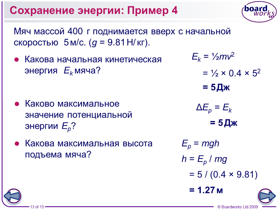 Мяч массой 400 г поднимается вверх с начальной скоростью 5 м/с. (g = 9.81 Н/ кг).