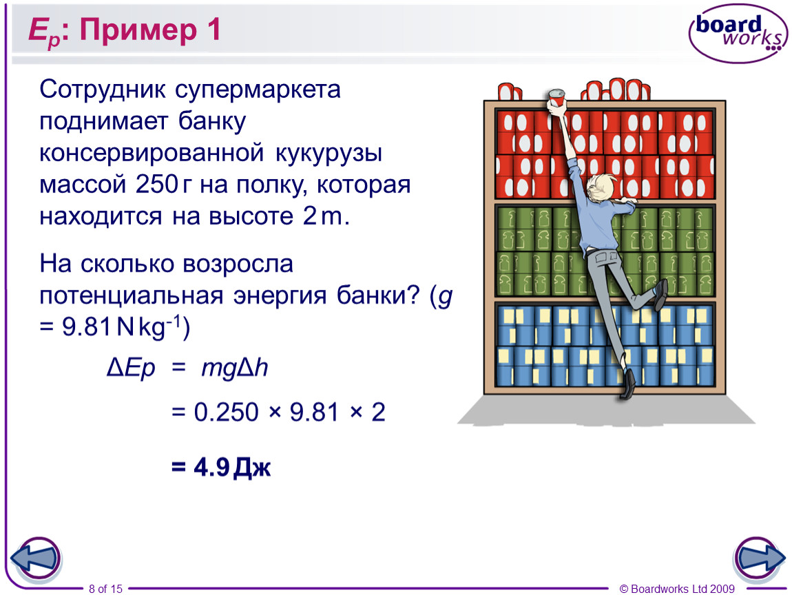 Сотрудник супермаркета поднимает банку консервированной кукурузы массой 250 г на полку, которая находится на высоте 2 m.