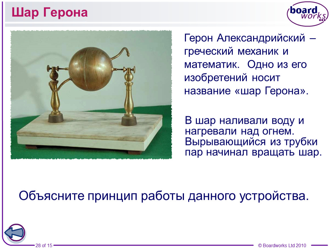 Герон Александрийский – греческий механик и математик. Одно из его изобретений носит название «шар Герона».