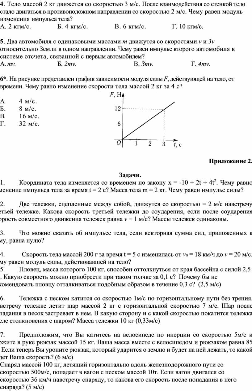 4. Тело массой 2 кг движется со скоростью 3 м/с. После взаимодействия со стенкой тело стало двигаться в противоположном направлении со скоростью 2 м/с. Чему равен модуль изменения импульса тела?