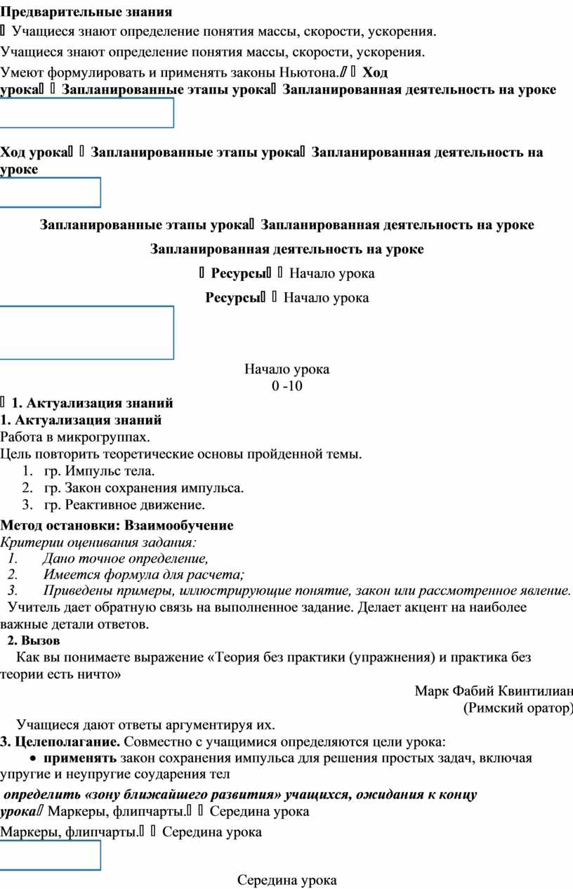 1. Актуализация знаний Работа в микрогруппах. Цель повторить теоретические основы пройденной темы. 1. гр. Импульс тела. 2. гр. Закон сохранения импульса. 3. гр. Реактивное движение. Метод остановки: Взаимообучение Критерии оценивания задания: 1. Дано точное определение, 2. Имеется формула для расчета; 3. Приведены примеры, иллюстрирующие понятие, закон или рассмотренное явление. Учитель дает обратную связь на выполненное задание. Делает акцент на наиболее важные детали ответов. 2. Вызов Как вы понимаете выражение «Теория без практики (упражнения) и практика без теории есть ничто» Марк Фабий Квинтилиан (Римский оратор) Учащиеся дают ответы аргументируя их. 3. Целеполагание. Совместно с учащимися определяются цели урока: · применять закон сохранения импульса для решения простых задач, включая упругие и неупругие соударения тел определить «зону ближайшего развития» учащихся, ожидания к концу урока |