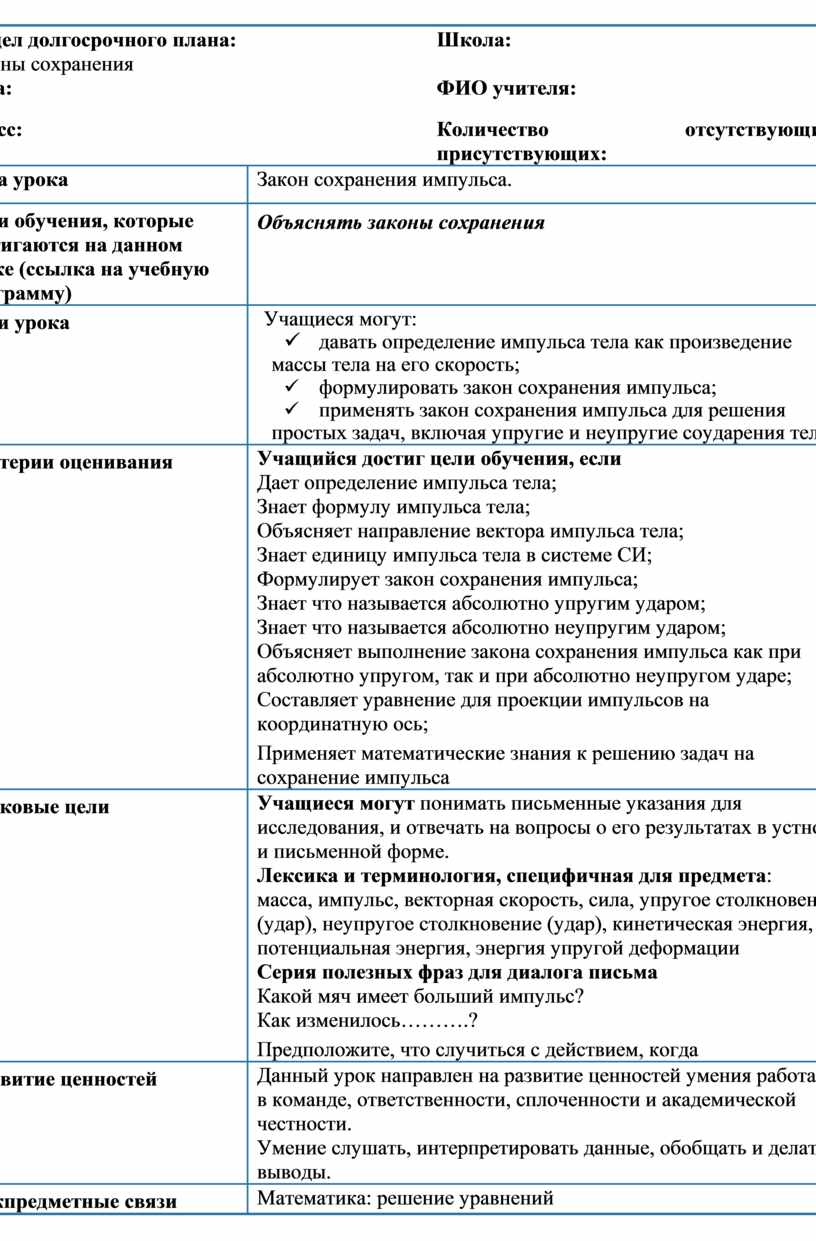 Раздел долгосрочного плана: Законы сохранения |
