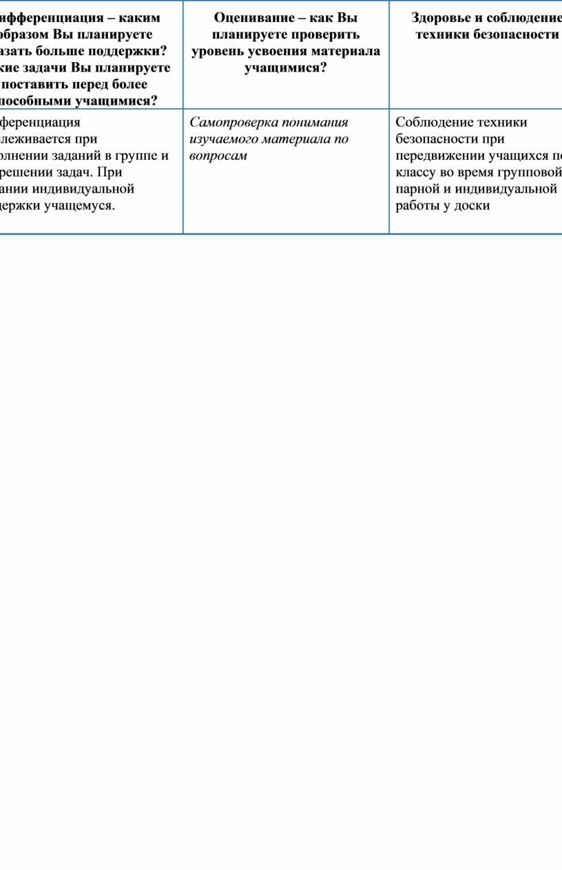 Дифференциация прослеживается при выполнении заданий в группе и при решении задач. При оказании индивидуальной поддержки учащемуся.