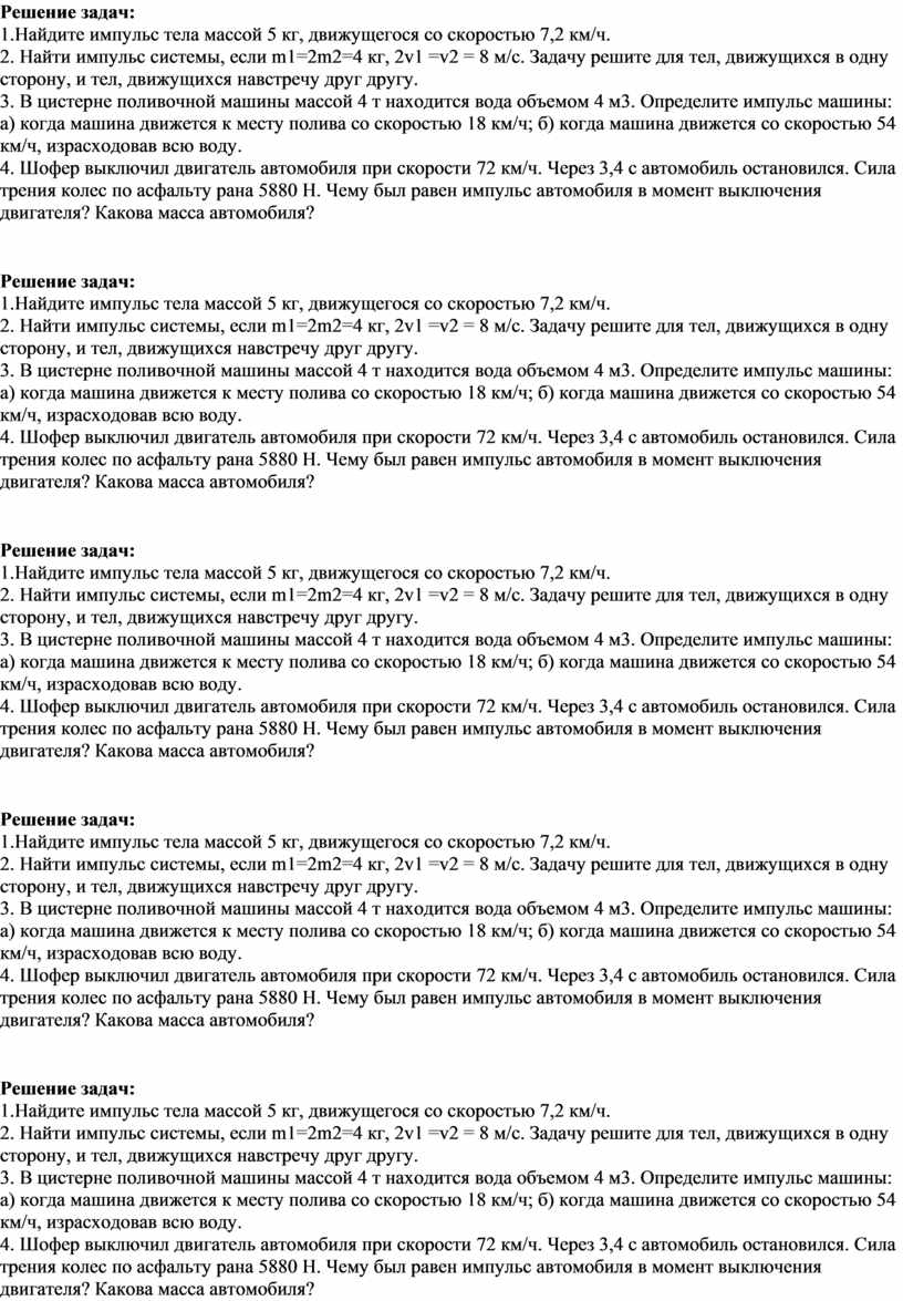 1.Найдите импульс тела массой 5 кг, движущегося со скоростью 7,2 км/ч.