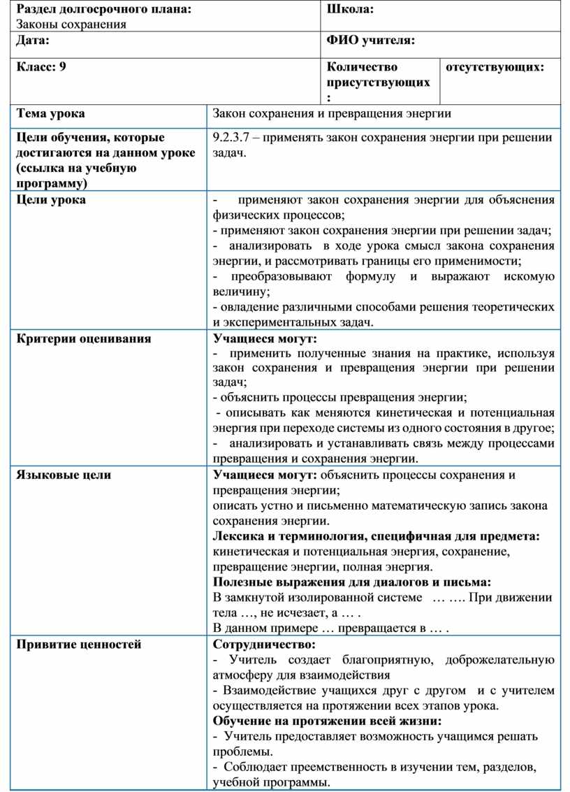 Учащиеся могут: объяснить процессы сохранения и превращения энергии; описать устно и письменно математическую запись закона сохранения энергии. Лексика и терминология, специфичная для предмета: кинетическая и потенциальная энергия, сохранение, превращение энергии, полная энергия. Полезные выражения для диалогов и письма: В замкнутой изолированной системе … …. При движении тела …, не исчезает, а … . В данном примере … превращается в … . |
