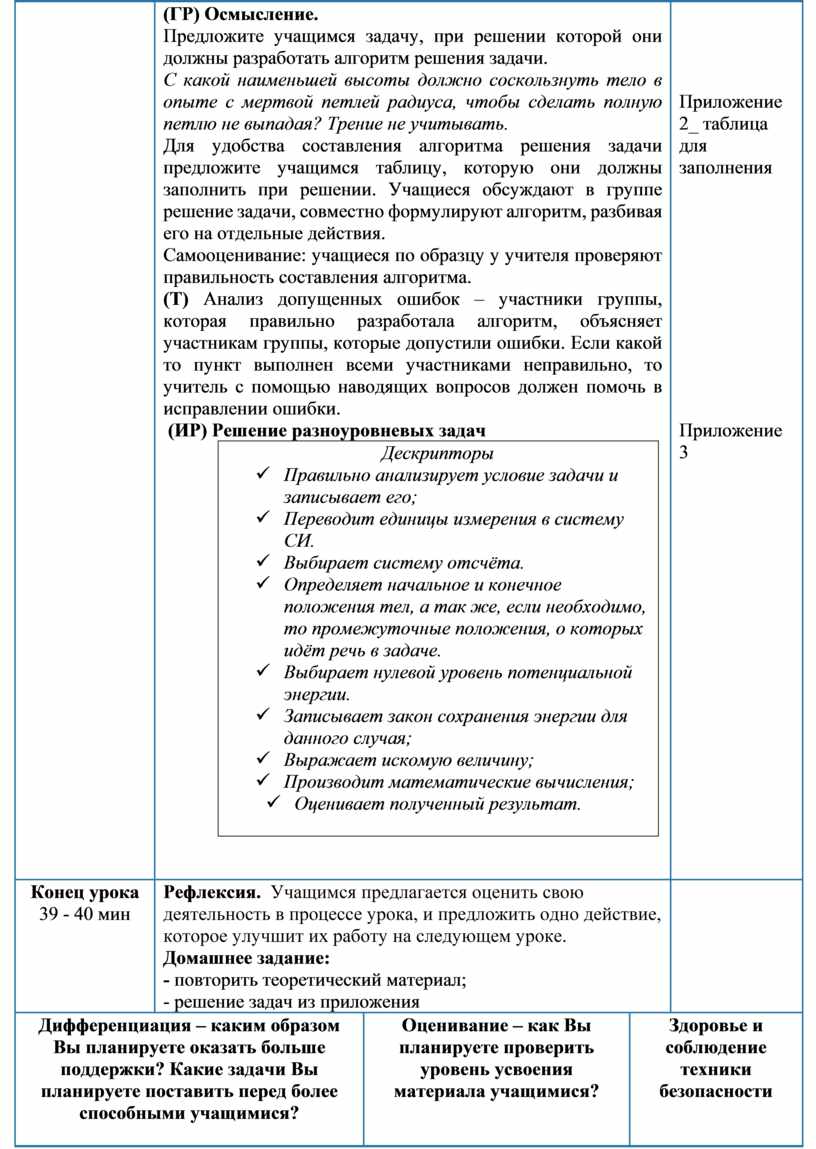 (ГР) Осмысление. Предложите учащимся задачу, при решении которой они должны разработать алгоритм решения задачи. С какой наименьшей высоты должно соскользнуть тело в опыте с мертвой петлей радиуса, чтобы сделать полную петлю не выпадая? Трение не учитывать. Для удобства составления алгоритма решения задачи предложите учащимся таблицу, которую они должны заполнить при решении. Учащиеся обсуждают в группе решение задачи, совместно формулируют алгоритм, разбивая его на отдельные действия. Самооценивание: учащиеся по образцу у учителя проверяют правильность составления алгоритма. (Т) Анализ допущенных ошибок – участники группы, которая правильно разработала алгоритм, объясняет участникам группы, которые допустили ошибки. Если какой то пункт выполнен всеми участниками неправильно, то учитель с помощью наводящих вопросов должен помочь в исправлении ошибки. (ИР) Решение разноуровневых задач