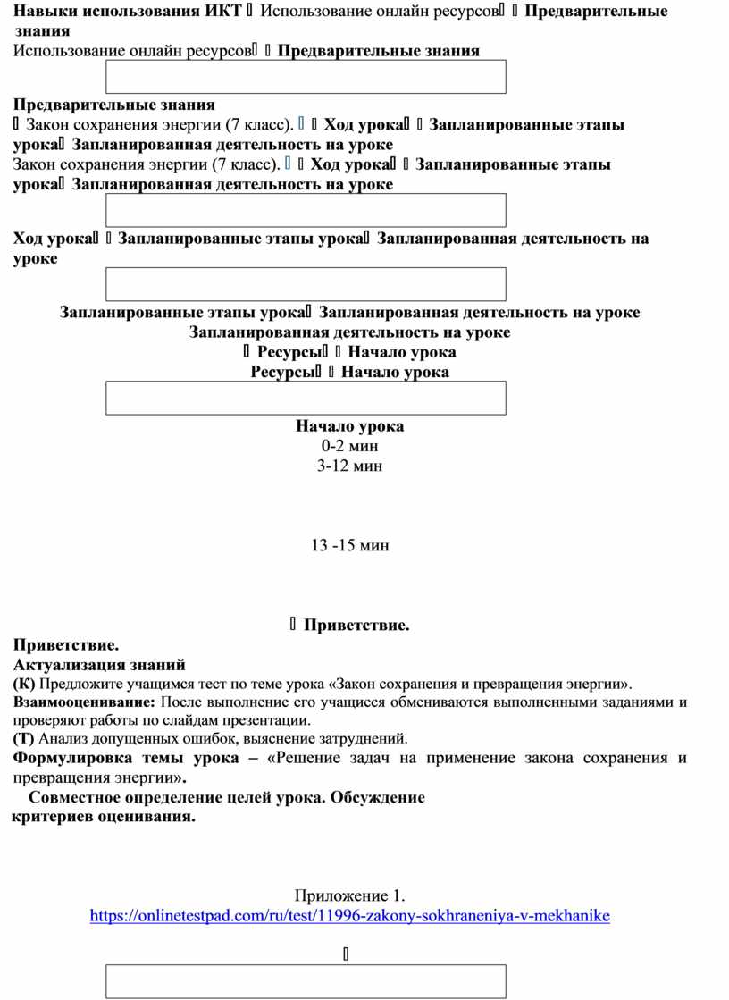 Приветствие. Актуализация знаний (К) Предложите учащимся тест по теме урока «Закон сохранения и превращения энергии». Взаимооценивание: После выполнение его учащиеся обмениваются выполненными заданиями и проверяют работы по слайдам презентации. (Т) Анализ допущенных ошибок, выяснение затруднений. Формулировка темы урока – «Решение задач на применение закона сохранения и превращения энергии». A. Совместное определение целей урока. Обсуждение критериев оценивания.