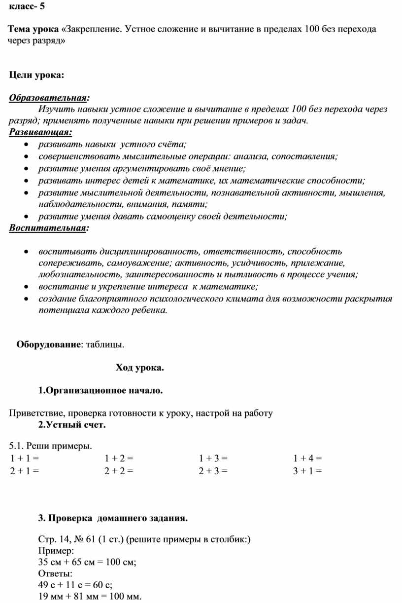Изучить навыки устное сложение и вычитание в пределах 100 без перехода через разряд; применять полученные навыки при решении примеров и задач.