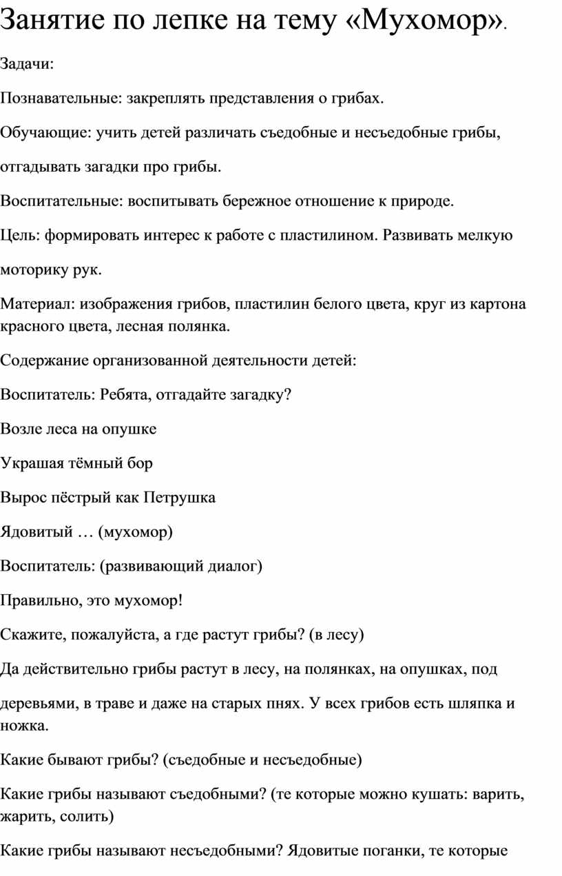 Материал: изображения грибов, пластилин белого цвета, круг из картона красного цвета, лесная полянка.