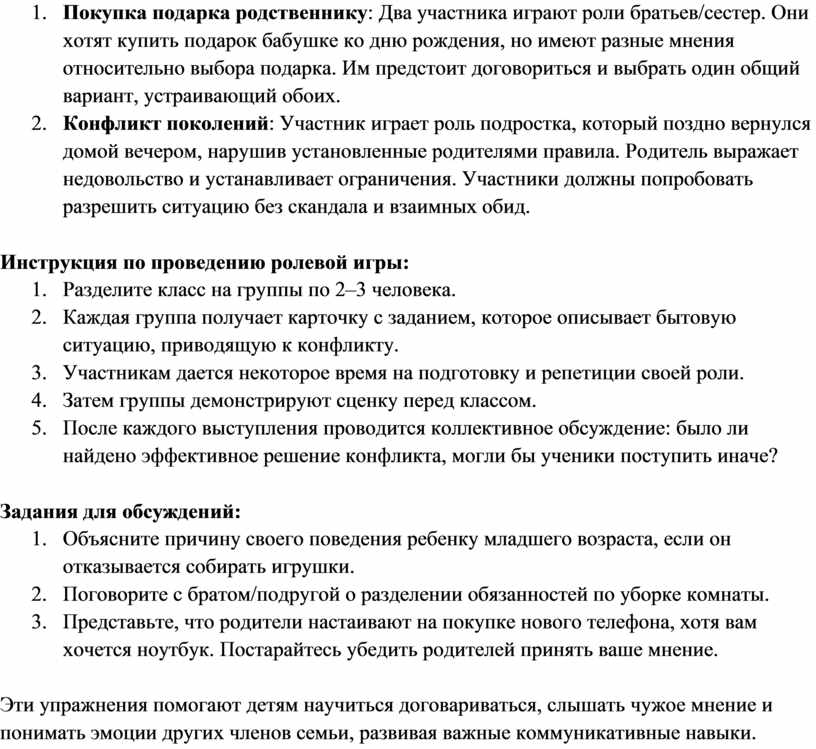 Ролевые игры и практические задания для школьников по теме “Избежание конфликтов в семье”