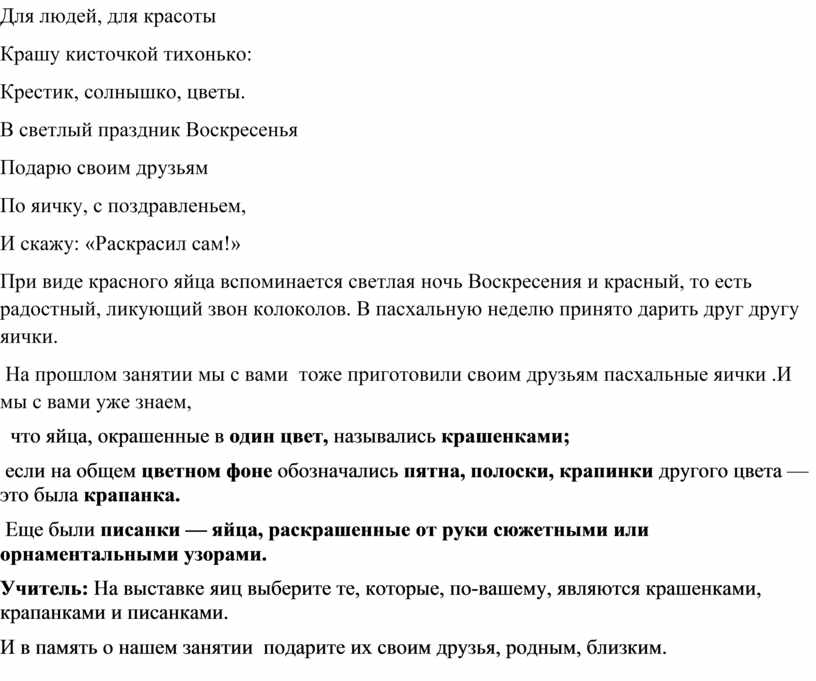 Нельзя представить Пасху без крашенных яиц. Красить их принято было в Страстной четверг .Какое радостное, светлое чувство будит в нас красное яичко! Радуется ему ребенок, только что начинающий жить, радуется старик, столько раз встретивший Пасху на своем веку.