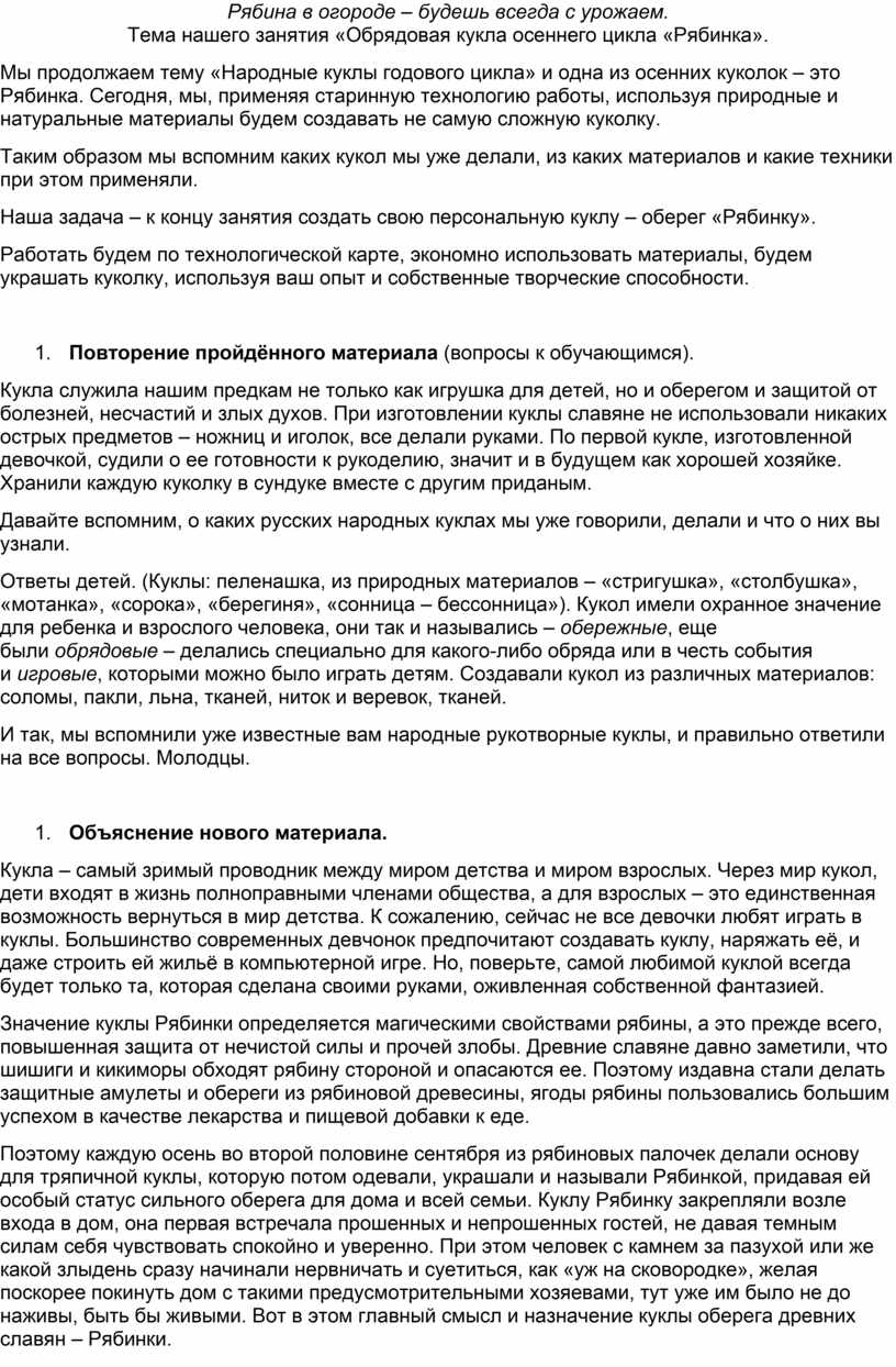 Тема нашего занятия «Обрядовая кукла осеннего цикла «Рябинка».