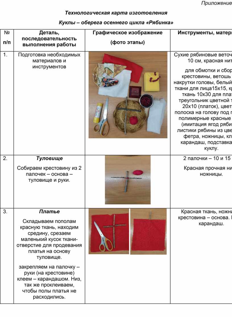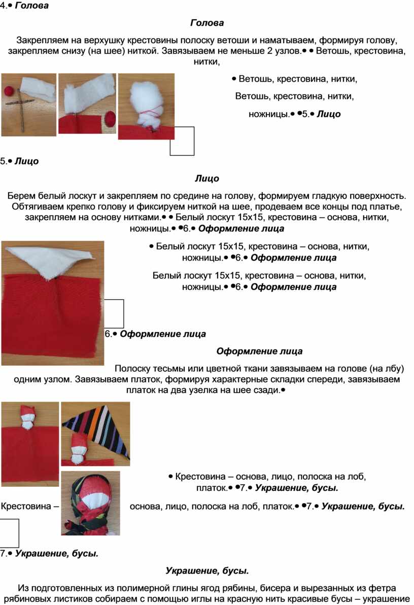 Сухие рябиновые веточки 15 и 10 см, красная нить для обмотки и сборки крестовины, ветошь для накрутки головы, белый лоскут ткани для лица15х15, красная ткань 10х30 для платья, треугольник цветной ткани 20х10 (платок), цветная полоска на голову под платок, полимерные красные бусы (имитация ягод рябины), листики рябины из цветного фетра, ножницы, клей-карандаш, подставка под куклу. |