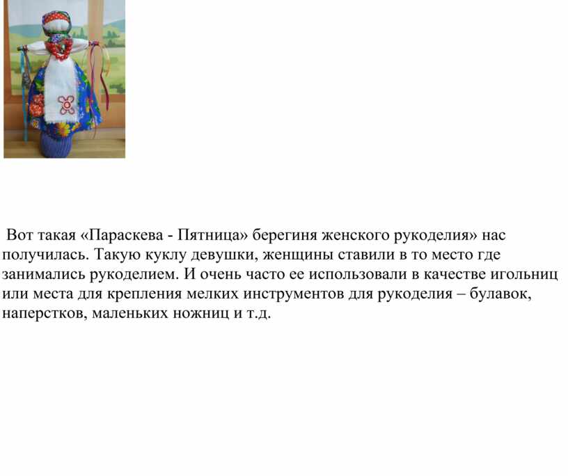 «Параскева Пятница» была заступница женского рукоделия и женского труда. История этой куклы такая: в древней Руси была такая женская богиня Макош. Она являлась покровительницей семьи, и молодые девушки просили суженого, счастья в семейных делах, так-же она покровительствовала домашним животным и разным ремеслам в том числе и женскому рукоделию.