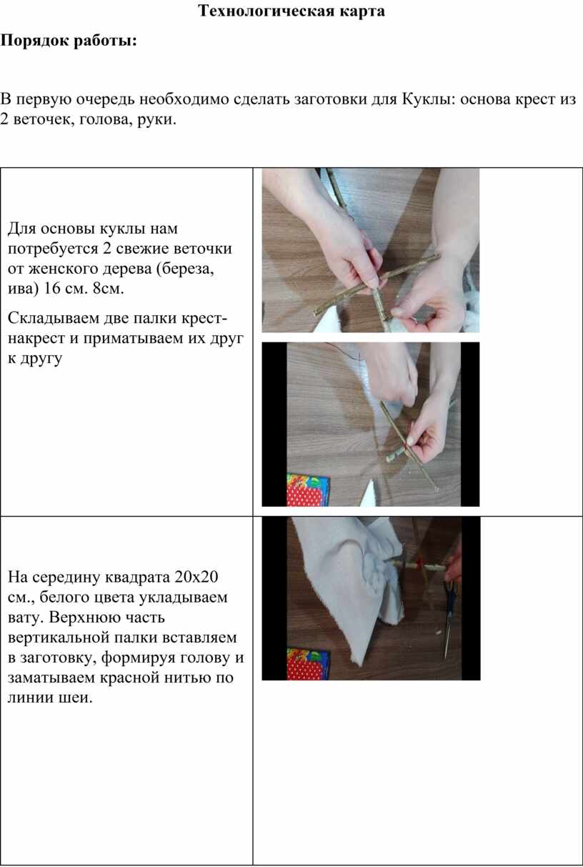 В первую очередь необходимо сделать заготовки для Куклы: основа крест из 2 веточек, голова, руки.