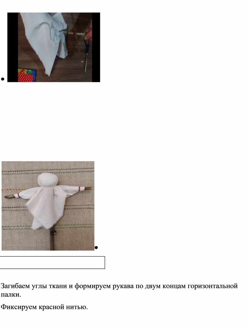 На середину квадрата 20х20 см., белого цвета укладываем вату. Верхнюю часть вертикальной палки вставляем в заготовку, формируя голову и заматываем красной нитью по линии шеи.