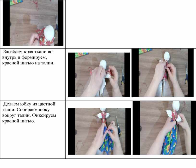 Делаем юбку из цветной ткани. Собираем юбку вокруг талии. Фиксируем красной нитью.