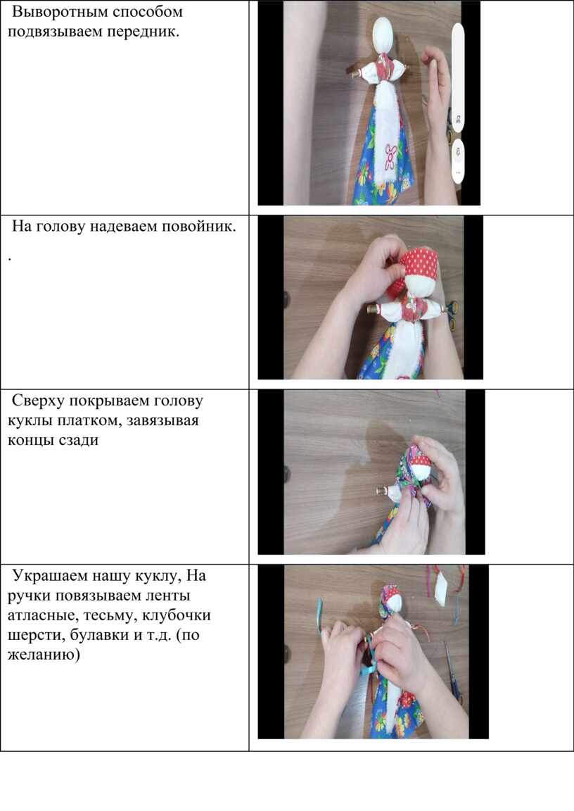Украшаем нашу куклу, На ручки повязываем ленты атласные, тесьму, клубочки шерсти, булавки и т.д. (по желанию)