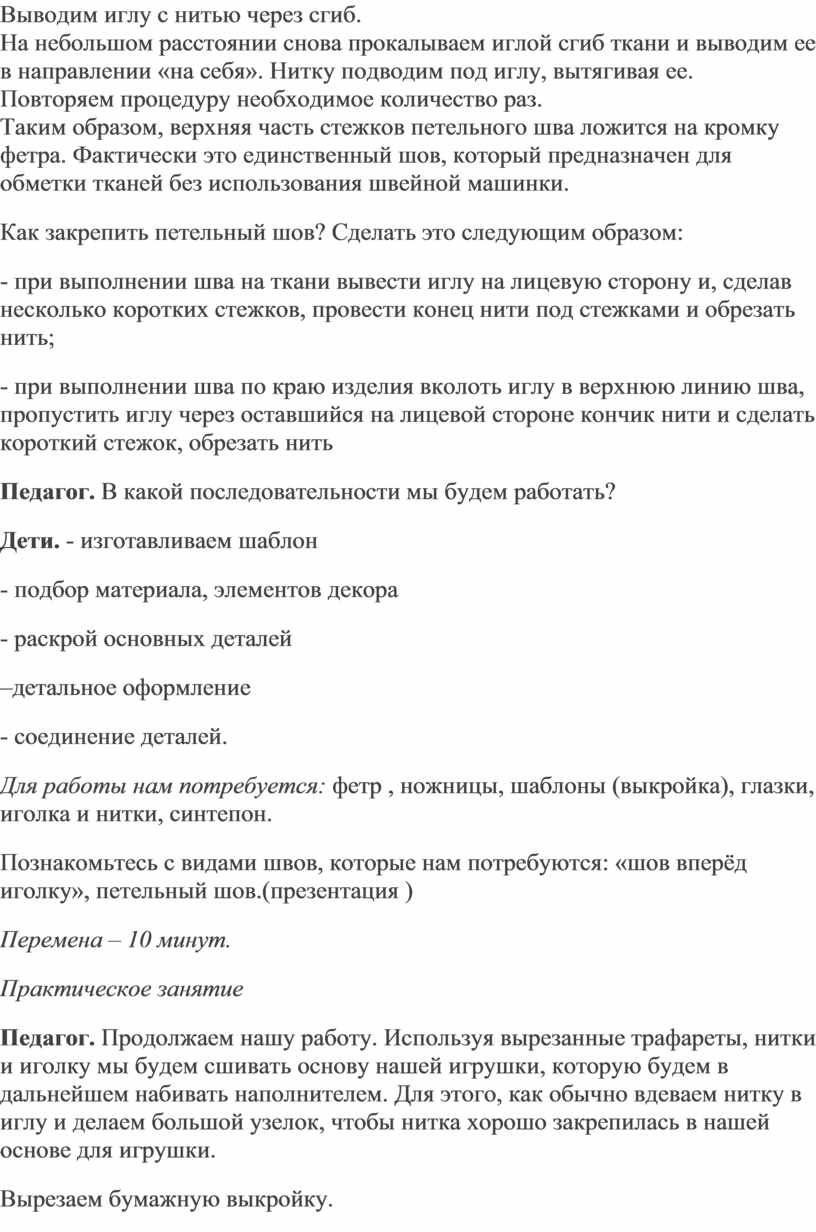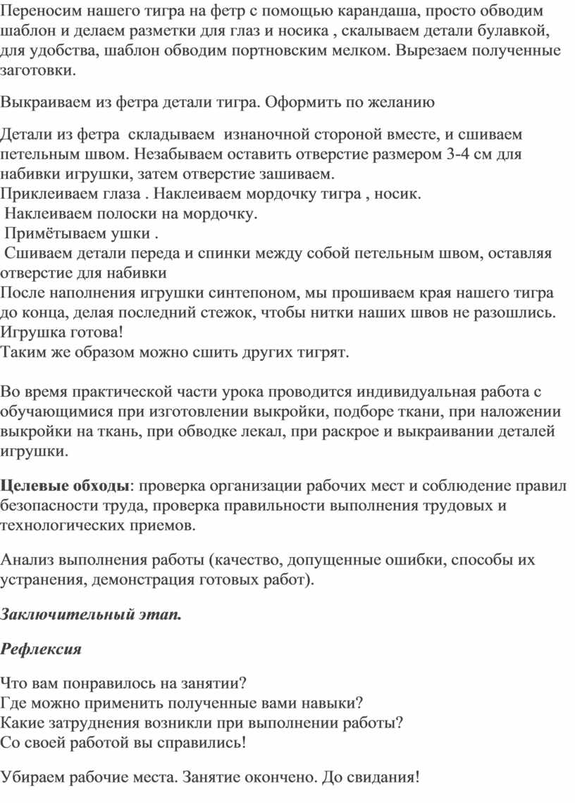 Во время практической части урока проводится индивидуальная работа с обучающимися при изготовлении выкройки, подборе ткани, при наложении выкройки на ткань, при обводке лекал, при раскрое и выкраивании деталей игрушки.