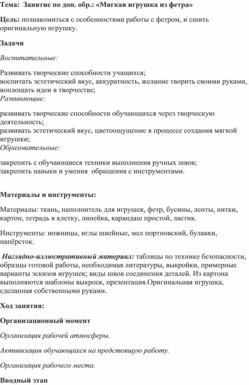 Тема: Занятие по доп. обр.: «Мягкая игрушка из фетра»
