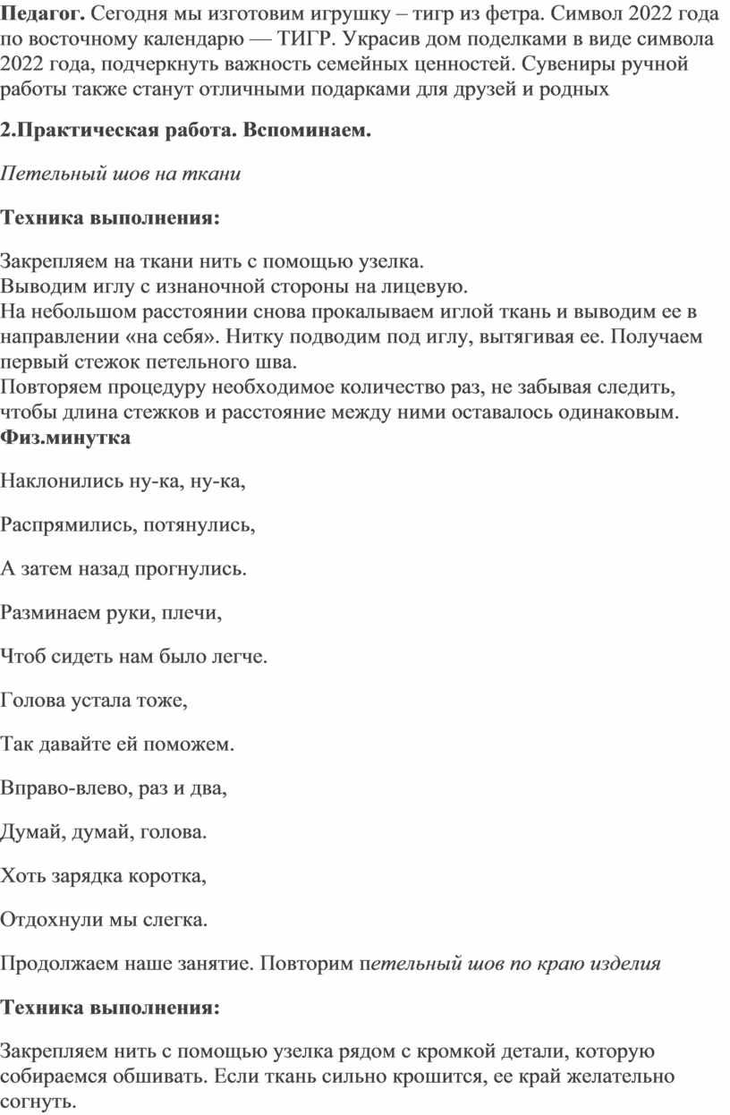 Педагог. Сегодня мы изготовим игрушку – тигр из фетра. Символ 2022 года по восточному календарю — ТИГР. Украсив дом поделками в виде символа 2022 года, подчеркнуть важность семейных ценностей. Сувениры ручной работы также станут отличными подарками для друзей и родных