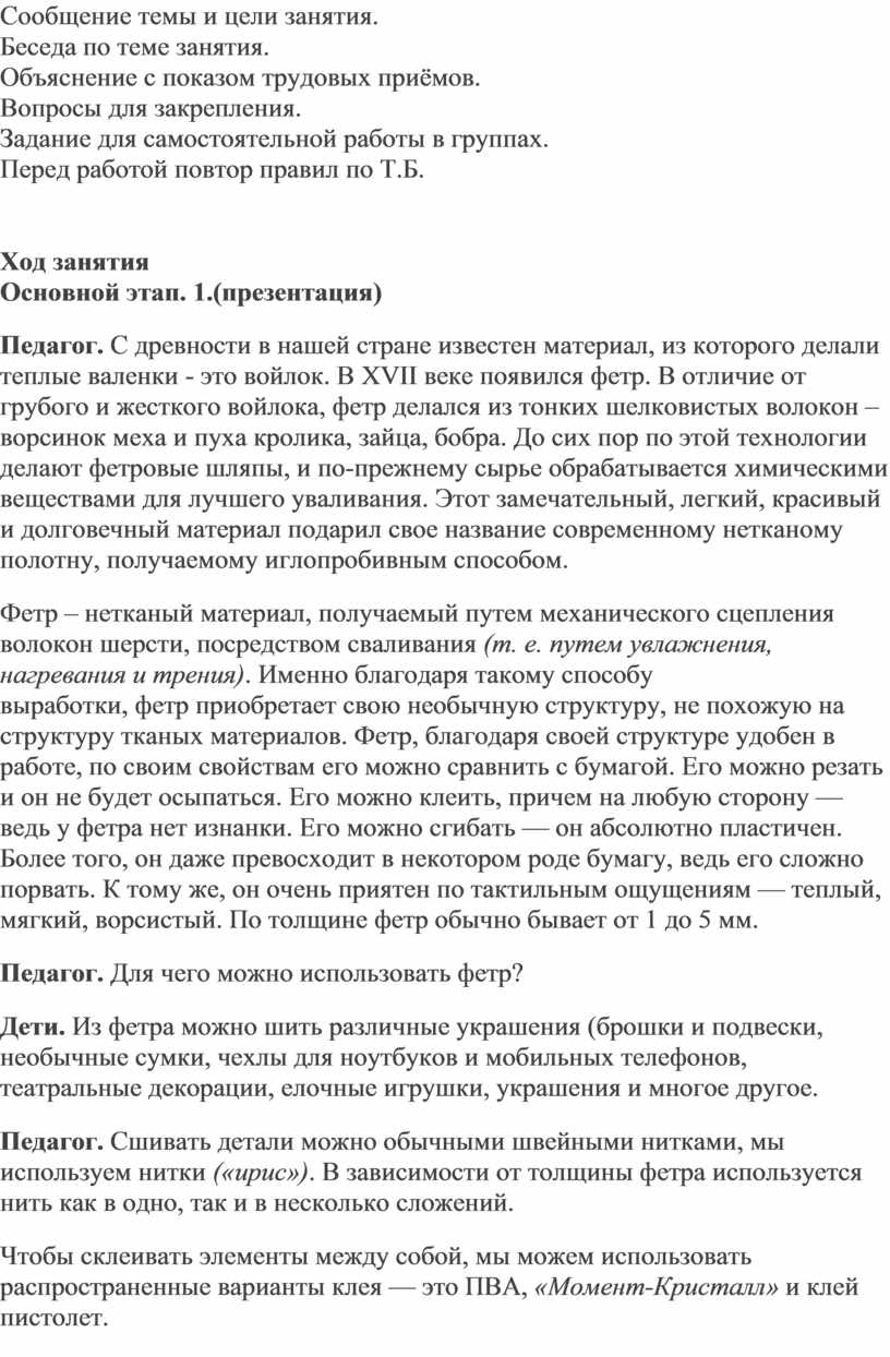 Педагог. С древности в нашей стране известен материал, из которого делали теплые валенки - это войлок. В XVII веке появился фетр. В отличие от грубого и жесткого войлока, фетр делался из тонких шелковистых волокон – ворсинок меха и пуха кролика, зайца, бобра. До сих пор по этой технологии делают фетровые шляпы, и по-прежнему сырье обрабатывается химическими веществами для лучшего уваливания. Этот замечательный, легкий, красивый и долговечный материал подарил свое название современному нетканому полотну, получаемому иглопробивным способом.